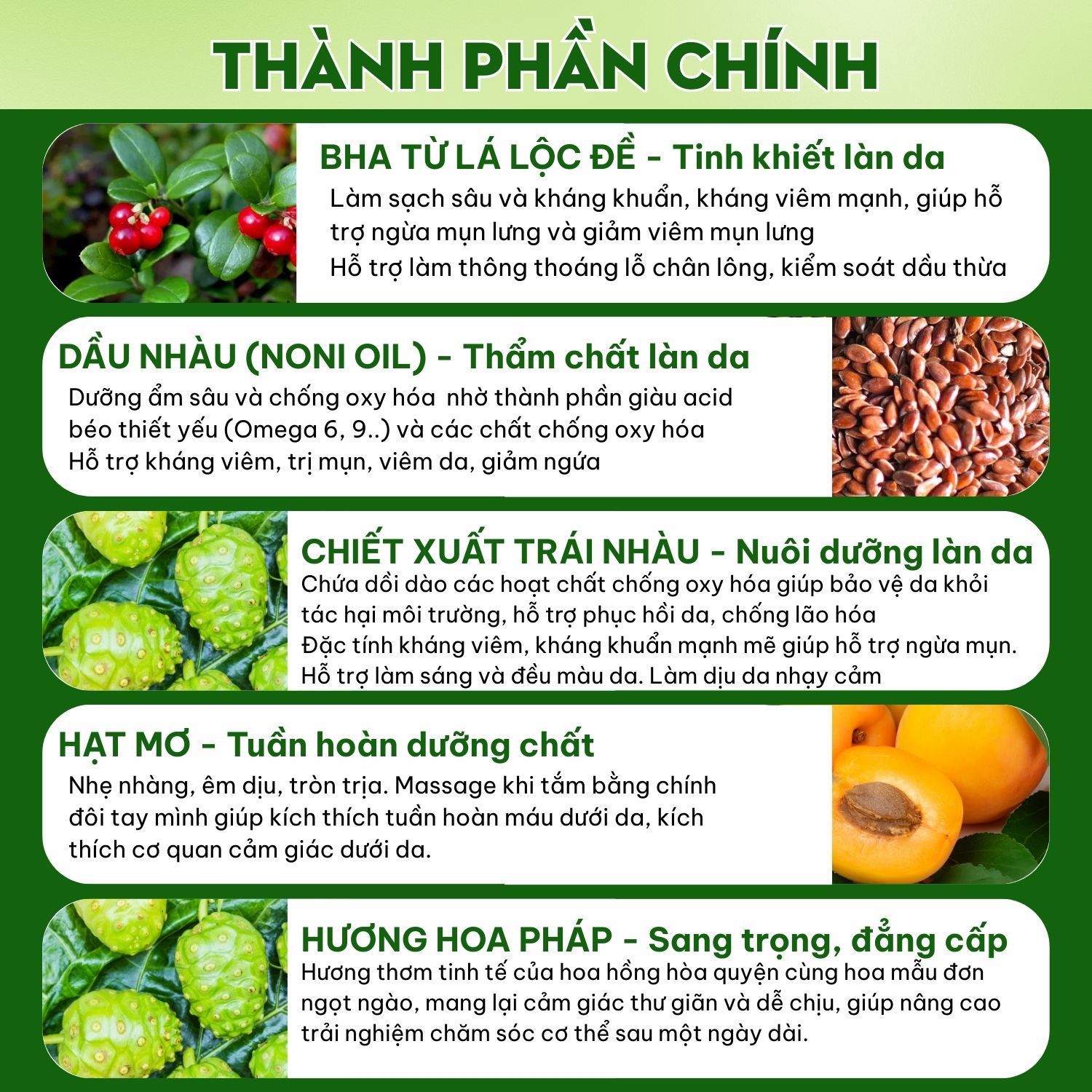 Thành phần Aqua,  Disodium Laureth Sulfosuccinate,  Cocamidopropyl Betaine, Glycerin, PEG-7 Glyceryl Cocoate, Sodium Chloride, Acrylates Copolymer, Parfum, Hydrated Silica, Phenoxyethanol, Triethanolamine, PEG-40 Hydrogenated Castor Oil, Sodium PCA, Lauryl Glucoside, Disodium Cocoyl Glutamate, Sodium Glutamate, Sodium Cocoate, Propylene Glycol, Morinda Citrifolia Extract, Morinda Citrifolia Seed Oil, Salicylic Acid, Tocopheryl Acetate, Polyquaternium-7, Benzophenone-4, Prunus Amygdalus Dulcis Shell Powder, Prunus Armeniaca Seed Powder, Juglans Regia Shell Powder, Disodium EDTA, Sodium Benzoate, CI 19140, CI 42090.