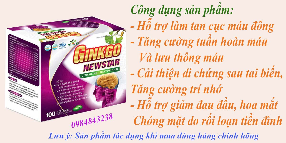 Ginkgo New Star Hỗ trợ hoạt huyết, tăng cường tuần hoàn máu não, giúp cải thiện các triệu chứng thiểu năng tuần hoàn não, Hỗ trợ làm tan cục máu đông, Cải thiện di chứng sau tai biến mạch máu não do tắc mạch, Tăng cường trí nhớ, Hỗ trợ giảm đau đầu, hoa mắt chóng mặt do rối loạn tiền đình ...